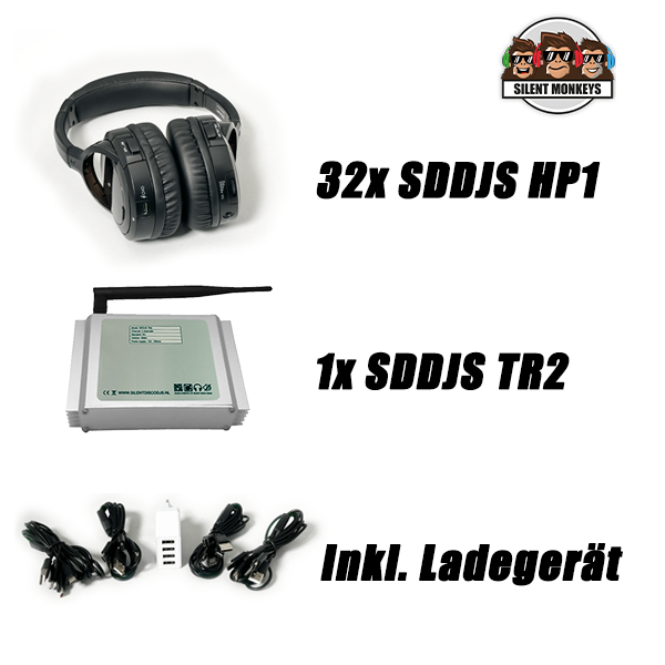 Silent-Disco Party mit 32 Personen feiern? Organisieren Sie oft eine Veranstaltung, bei der Sie eine große Anzahl von Silent-Disco-Kopfhörern benötigen? Dann haben wir dieses komplette Silent-Disco-Set für Sie zusammengestellt. Mit bis zu 32 Personen gleichzeitig Silent Disco! Dieses Set enthält die HP1-Kopfhörer, unsere meistgenutzten Kopfhörer. Robust, gute Klangqualität und extrem bequem, das sind die Schlagworte für dieses Modell! Ideal für Silent Disco mit mehreren DJs, Silent Cinema oder geführte Tour! Auch bei Workshops, Konferenzen und Präsentationen auf Messen sind diese kabellosen Kopfhörer sehr nützlich. Aber auch auf Partys oder Festivals findet man diese Kopfhörer oft. Die Kopfhörer sind batteriebetrieben. Um diese aufzuladen, sind die Ladegeräte ebenfalls in diesem Set enthalten. Außerdem erhalten Sie mit diesem Set unseren SDDJS TR2 Sender. Der TR2 ist ein wesentlicher Bestandteil der Silent Disco. Sie verwenden den Sender, um das Signal zu übertragen, das auf den Kopfhörern gehört werden soll.
